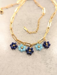 Adorable chaîne collier agrémentée de myosotis en perles de rocailles